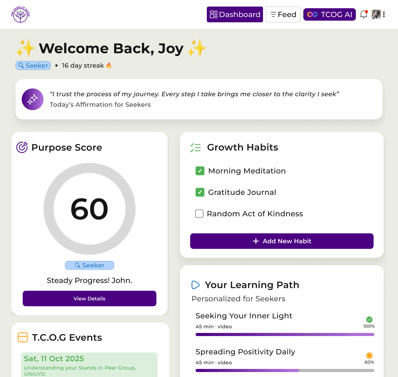 TCOG blends AI, community, and personal development tools to help you grow in clarity, discipline, and spirituality — all in one platform.